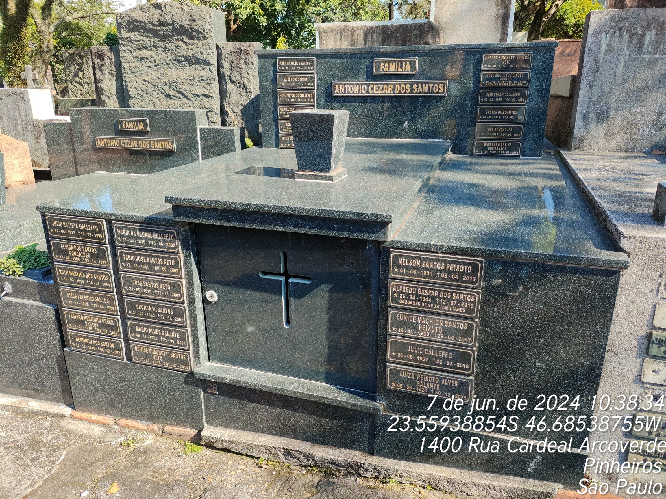 LUIZA PEIXOTO ALVES GALANTE - 30/12/2021, ALICE PALERMO DOS SANTOS - 27/04/1999, RUTH MARTINS DOS SANTOS - 20/03/1999, MARIO ALVES GALANTE - 21/06/2004, JOSE SANTOS NETO - 28/11/2002, MARIA DA GLORIA CALLEFO - 15/06/2002, MARLENE MARTINS DOS SANTOS - 15/09/1995, FABIANO HERMINIO CESAR SANTOS - 04/07/1999, JAIR CESAR CALLEFFO - 04/02/1984, ELVIRA DOS SANTOS ANTONEO - 05/10/1998, HERMINIO DOS SANTOS - 05/03/2002, MARCOS SIMONETTI SANTOS NETO - 02/03/1980, ANNA MARIA DOS SANTOS - 24/10/1943, NATI MORTO - 31/05/1985, GASPAR DOS SANTOS - 21/02/1987, JOSE GON€ALVES - 24/03/1989, JOSE ANTONIO GONCALVES - 06/12/1958, MARIA JOSE LEONEL DOS SANTOS - 17/12/1967, JOSE AUGUSTO PEIXOTO - 15/06/1982, RENATO SANDRINI - 16/03/1971, MARIA CESAR DOS SANTOS PEIXOTO - 01/07/1977