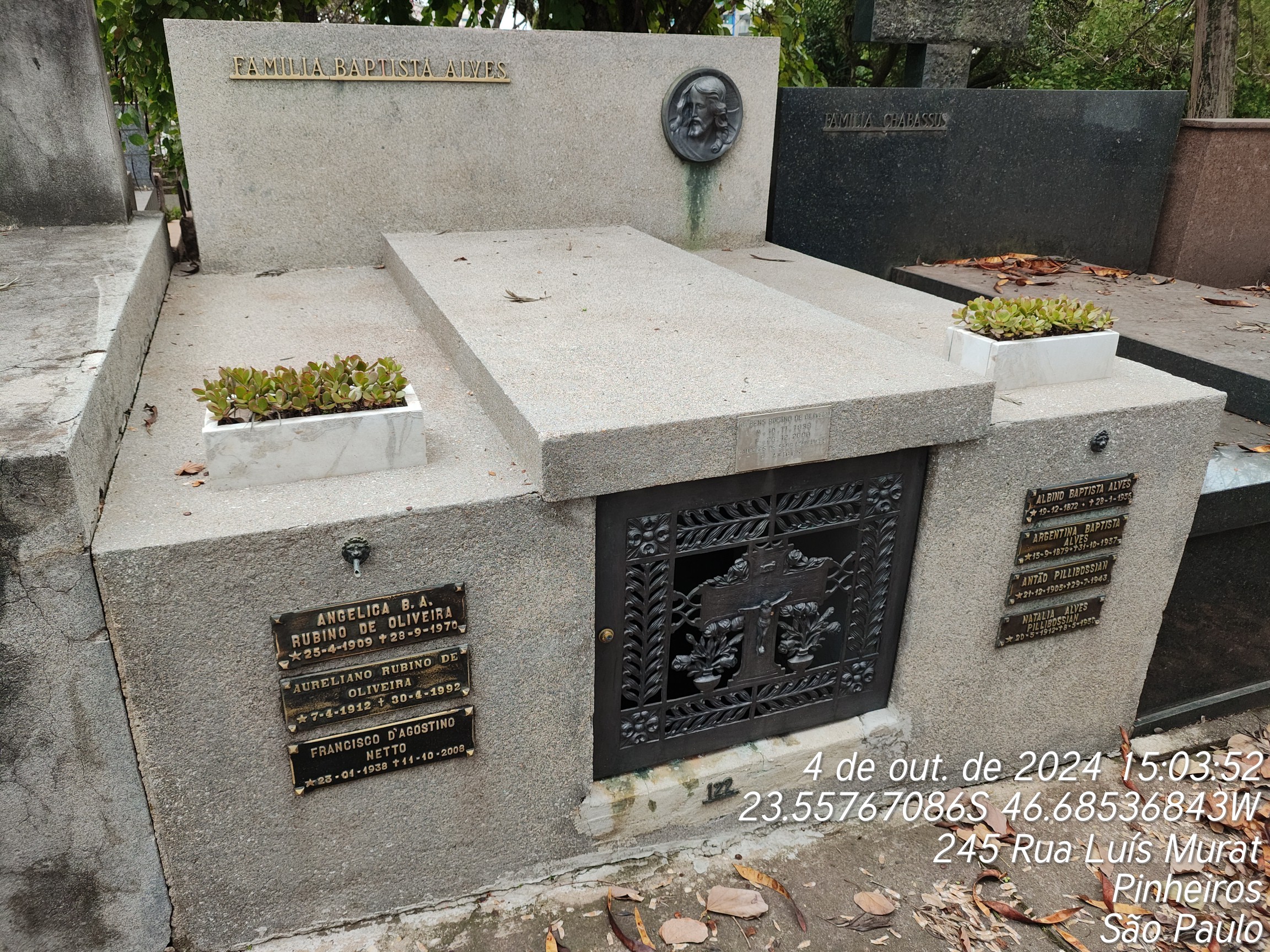 AURELIANO RUBINO DE OLIVEIRA - 30/04/1992, ANTAO PILLEBOSSIAN - 02/09/2003, ANGELICA BAPTISTA ALVES DE OLIVEIRA - 27/09/1970, ANGELINA ABATE DE AMORIM - 12/08/1982, ARGENTINA BATISTA ALVES - 31/10/1956, NATI MORTO - 26/08/1971, NATI MORTO - 26/08/1971, INES MENZIO - 10/10/1945, ALBINO BATISTA ALVES - 28/01/1956, FRANCISCO D`AGOSTINHO NETTO - 11/10/2008