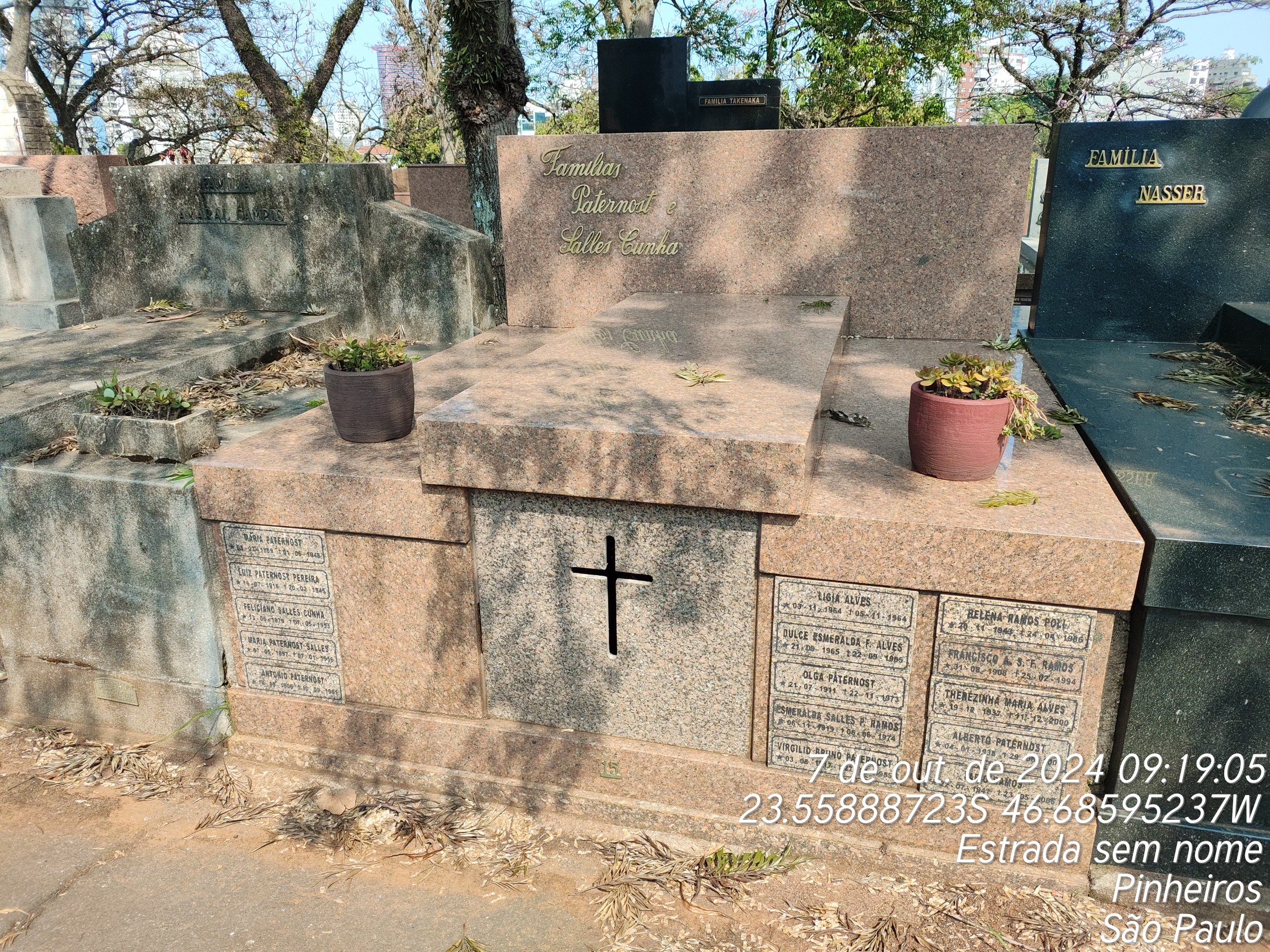 ALBERTO PATERNOST - 29/06/2001, THEREZINHA MARIA ALVES - 11/12/2000, FRANCISCO ANTONIO S.F.RAMOS - 25/02/1994, VIDA PATERNOST - 18/07/2022, FABIO RAMOS - 23/05/2006, VIRGILIO BRUNO PATERNOST - 28/03/1985, DULCE ESMERALDA FELOMENA ALVES - 21/09/1965, LIGIA ALVES - 04/11/1964, OLGA PATERNOSTT - 22/11/1973, HELENA RAMOS - 24/04/1986, NATI-MORTO - 25/04/1986, ANTONIO PATERNOST - 09/09/1961, FRANCISCO PATERNORT - 28/05/1955, ESMERALDA SALLES PEREIRA RAMOS - 05/06/1974, FELICIANO SALLES CUNHA - 07/05/1953, MARIA PATERNOST - 01/06/1945, MARIA PATERNOST SALLES - 07/02/1956