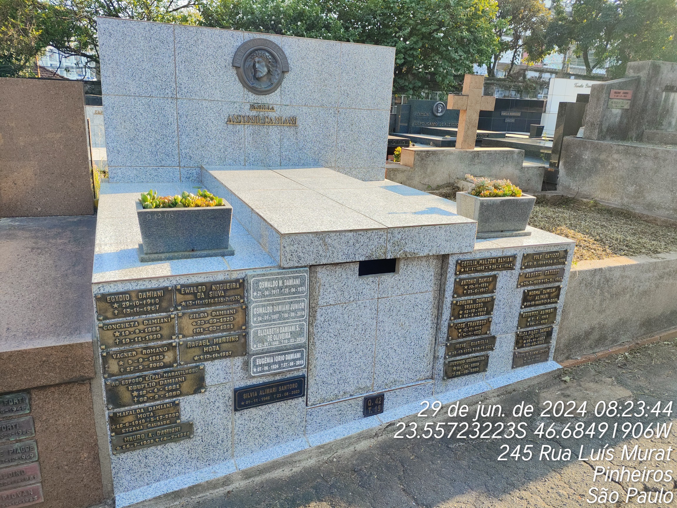 ZILDA DAMIANI - 01/03/1994, EDUARDO ALIMARI - 15/01/1988, NORMA ALIMARI - 27/09/2000, ADELINA DAMIANI TRAVERSO - 17/02/1997, MAFALDA DAMIANI MOTA - 05/12/2000, YOLE CATUZZO - 24/08/1998, ANTONIO GUARILIA - 27/08/1989, CECILIA MALZONI DAMIANI - 28/04/1945, ANTONIO DAMIANI - 25/06/1967, MARIO RAFAEL PIAZZI - 15/12/1965, EDUYLIO DAMIANI JUNIOR - 11/07/1962, EGYDIO DAMIANI - 13/11/1967, NATI MORTO - 22/06/1966, CONCETTA DAMIANI - 19/11/1990, ALBERTO CATUZZO - 19/05/1987, RAFAEL MARTINS MOTA - 17/11/1987, OSWALDO DAMIANI MALZONI - 25/04/1976, EWALDO NOGUEIRA DA SILVA - 16/07/1976, NATI MORTO - 25/10/1976, IRENE GUARAGLIA - 04/11/2009