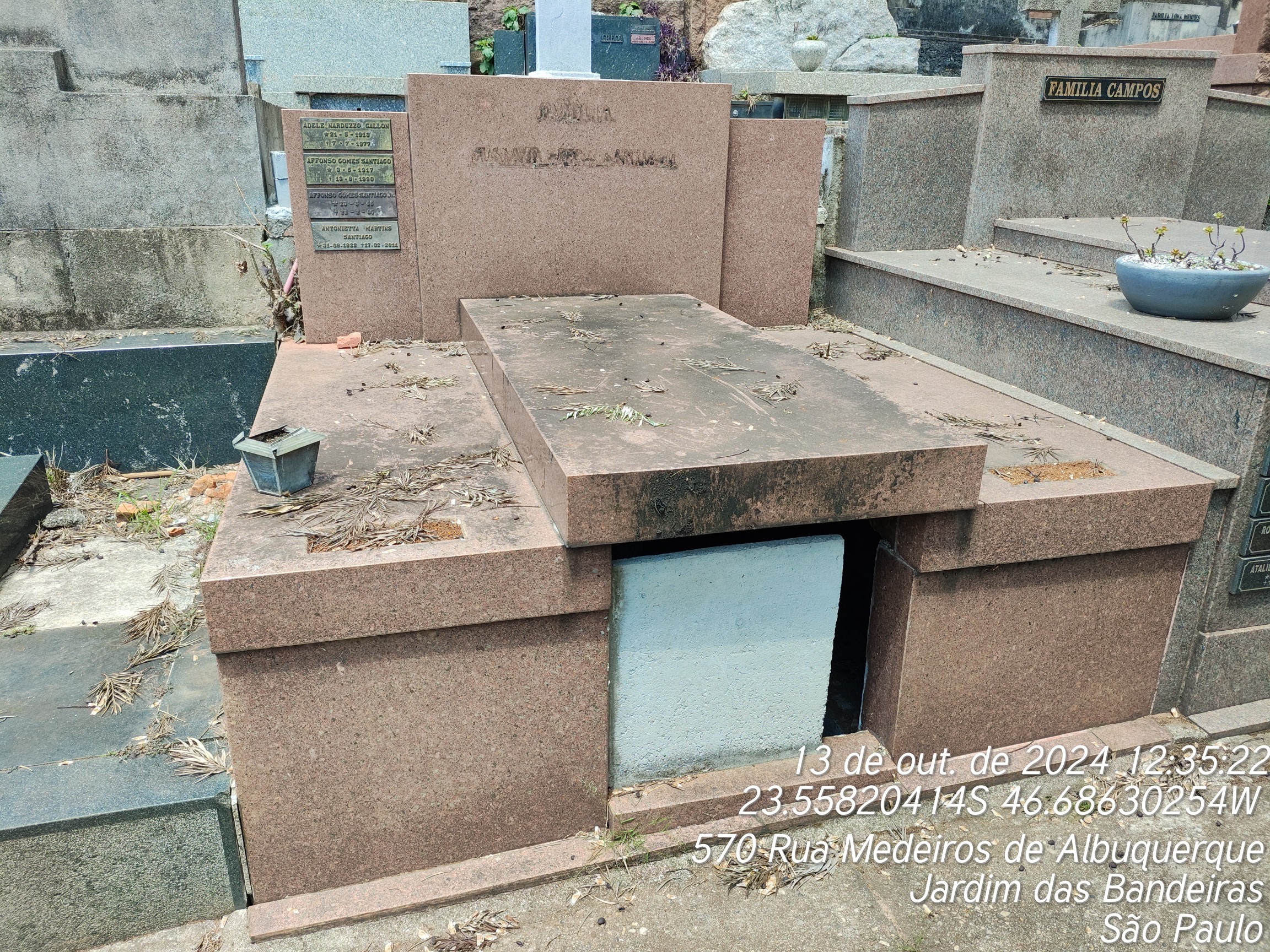 JOSE GOMES SANTIAGO - 29/03/1998, RUTH BALESTRO SANTIAGO - 04/07/1993, AFFONSO GOMES SANTIAGO JUNIOR - 21/02/2005, AFFONSO GOMES SANTIAGO - 13/08/1990, GUSTAVO GOMES SANTHIAGO - 17/02/1950, FRANCISCA BRAGHIN - 11/04/1990, DEOLINDA DA CONCEICAO SANTIAGO - 10/05/1977, JOAQUIM AUGUSTO RODRIGUES - 19/11/1959, ADILE NARDUZZI GALLON - 08/07/1977