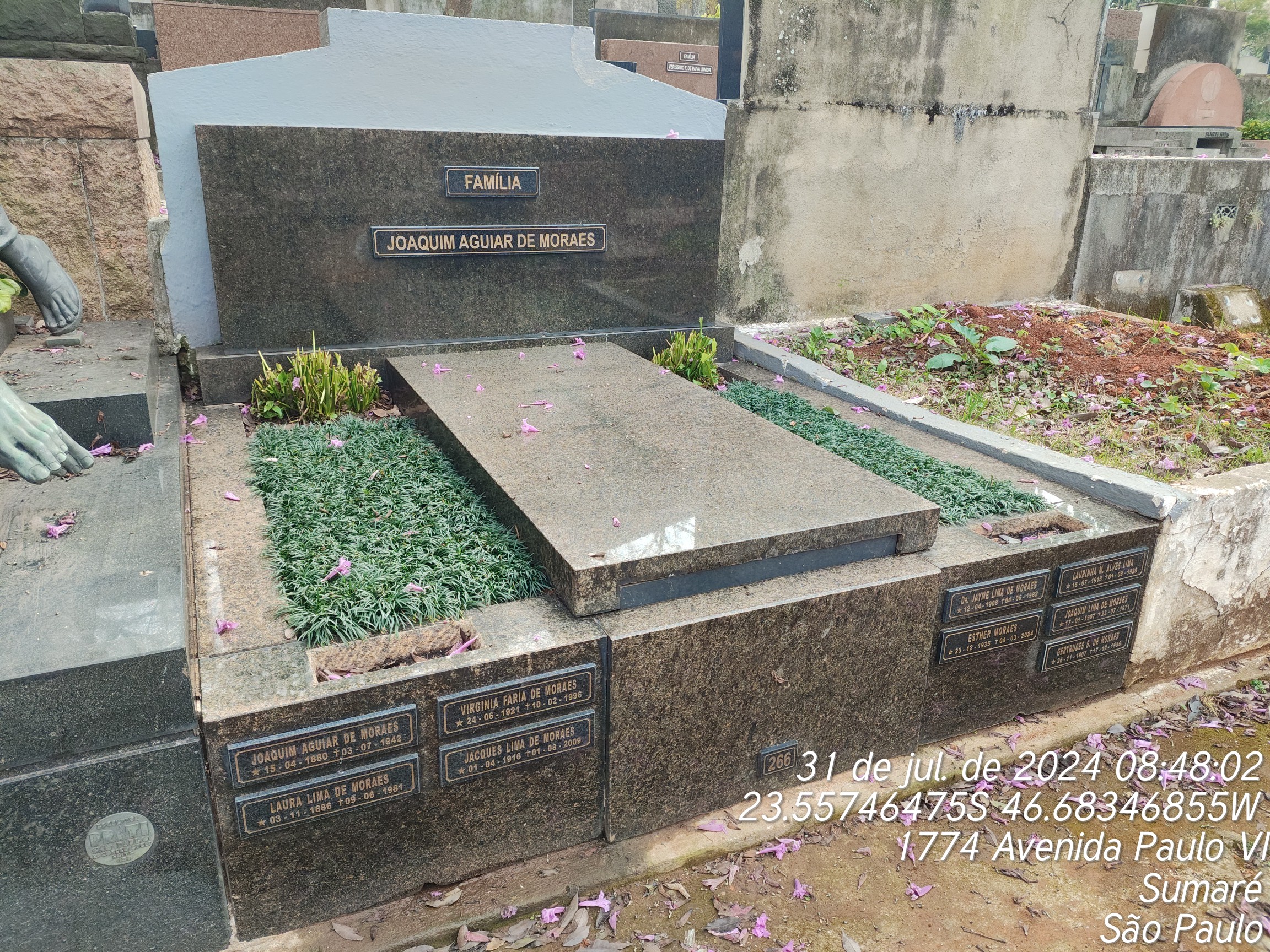 JAYME LIMA DE MORAES - 6/5/1982, GERTUDES STEIMER DE MORAES - 12/18/1986, CHRISTINA MACEDO DE AZEVEDO - 6/3/1983,LAURA LIMA DE MORAES - 6/9/1981, JOAGUIM LIMA DE MORAES - 7/24/1971, JACQUES LIMA DE MORAES - 8/2/2009, VIRGINIA FARIA DE MOARES - 2/11/1996, ESTHER MORAES - 3/5/2024