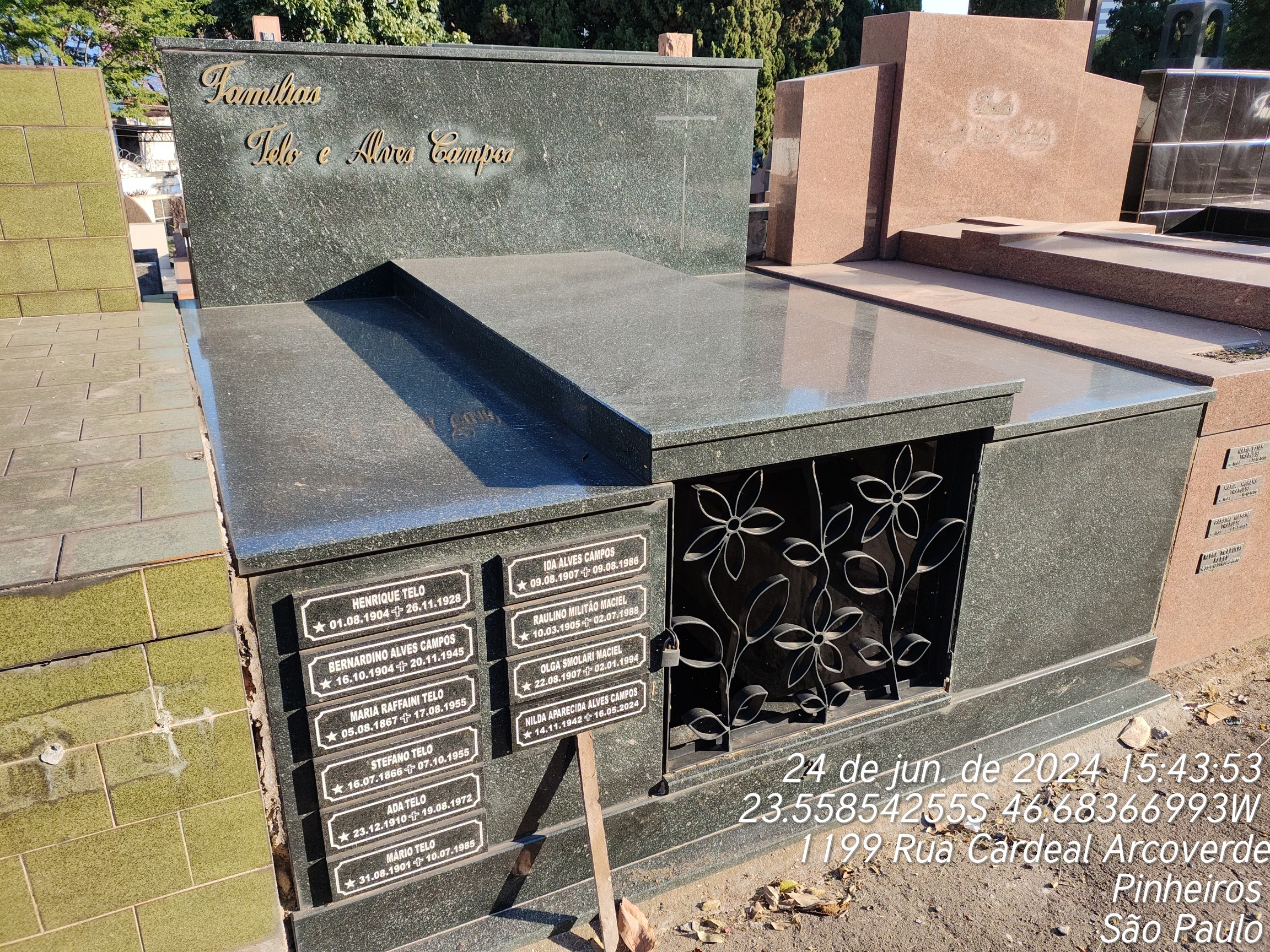 BENEDITA DE JESUS OLIVEIRA - 16/02/1964, BENEDITA ALVES DE PAULA - 19/07/1964, ADA TELO - 18/08/1972, IDA ALVES CAMPOS - 09/08/1986, BERNARDINO ALVES DE CAMPOS - 20/11/1945, MARIA ROFFOINI T. - 17/08/1955, STEFANO TELO - 07/10/1955