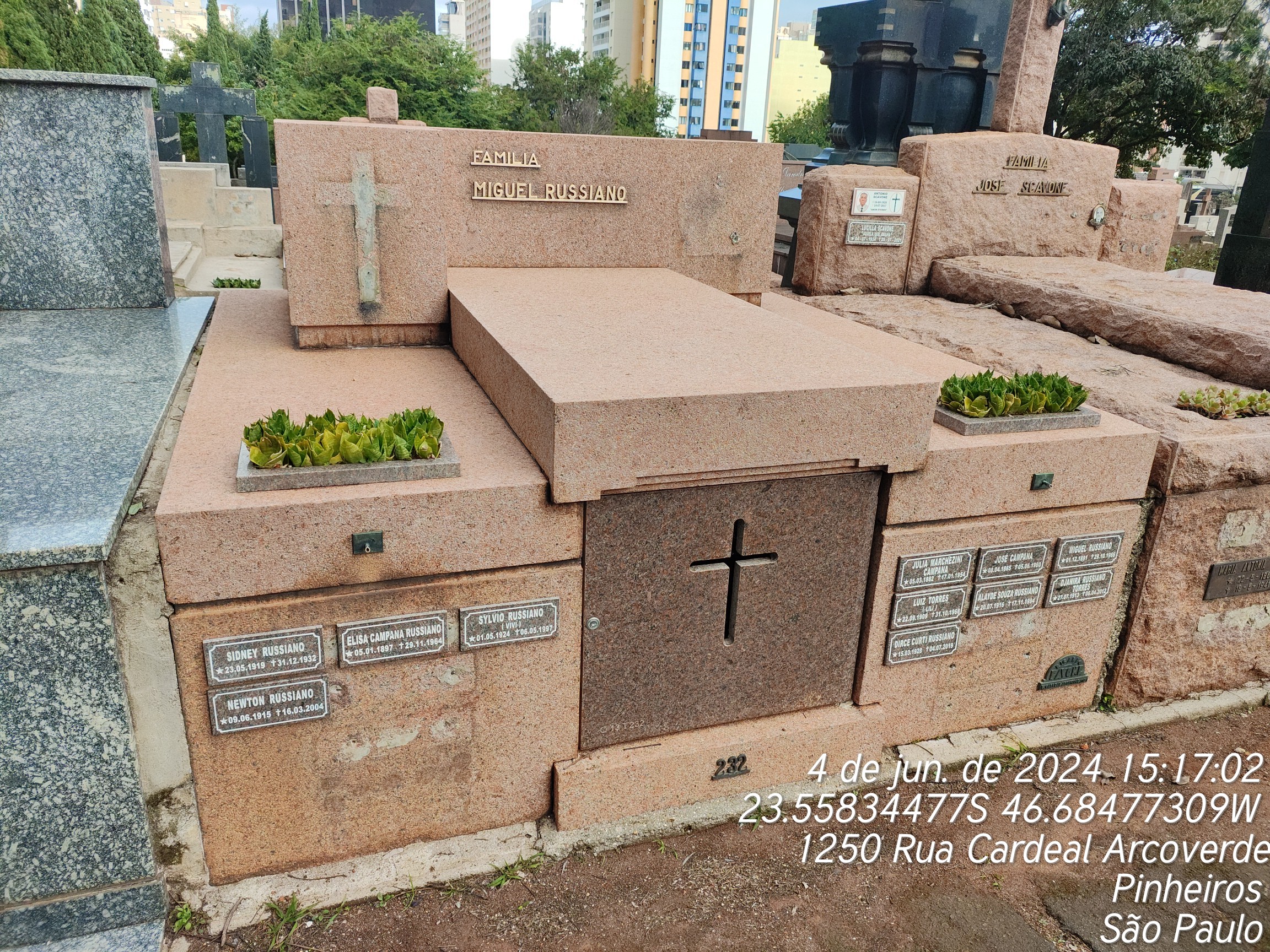 NEWTON RUSSIANO - 16/03/2004, SYLVIO RUSSIANO - 06/05/1997, ALAYDE SOUZA RUSSIANO - 17/11/1994, SIDNEY RUSSIANO - 31/12/1932, JOSE CAMPANA - 05/06/1960, ELISA CAMPANA RUSSIANO - 29/11/1964, MIGUEL RUSSIAVO - 29/10/1966, LUIZ TORRES - 30/10/1968, JULIA MARCHESINI CAMPANA - 17/01/1954