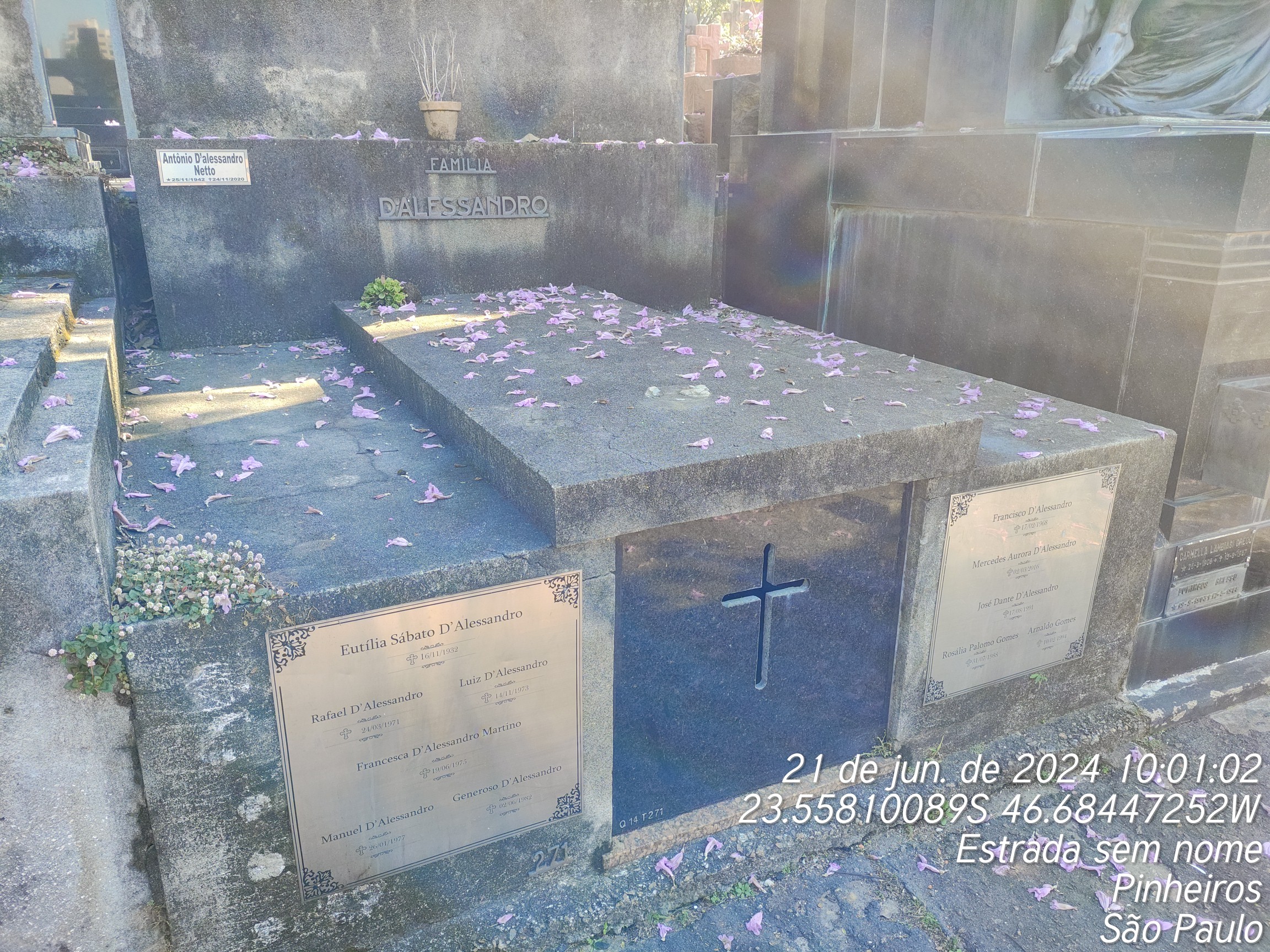 ARNALDO GOMES - 09/12/1994, JOSE DANTE D'ALESSANDRO - 17/08/1991, ROSA MARTINO GOMES - 09/01/2022, ANTONIO D.ALESSANDRO NETTO - 24/11/2020, EUTILIA SABAT D ALESSANDRO - 15/11/1932, FRANCISCA D`ALEESANDRO MARTINO - 18/06/1975, MANOEL D`ALESSANDRO - 25/01/1977, GENEROSO D'ALESSANDRO - 01/06/1982, FRANCISCO D ALESSANDRO - 16/02/1968, RAFAEL D ALESSANDRO - 23/03/1971, LUIZ D`ALESSANDRO - 13/01/1973, ROSALIA PALOMO GOMES - 30/07/1988