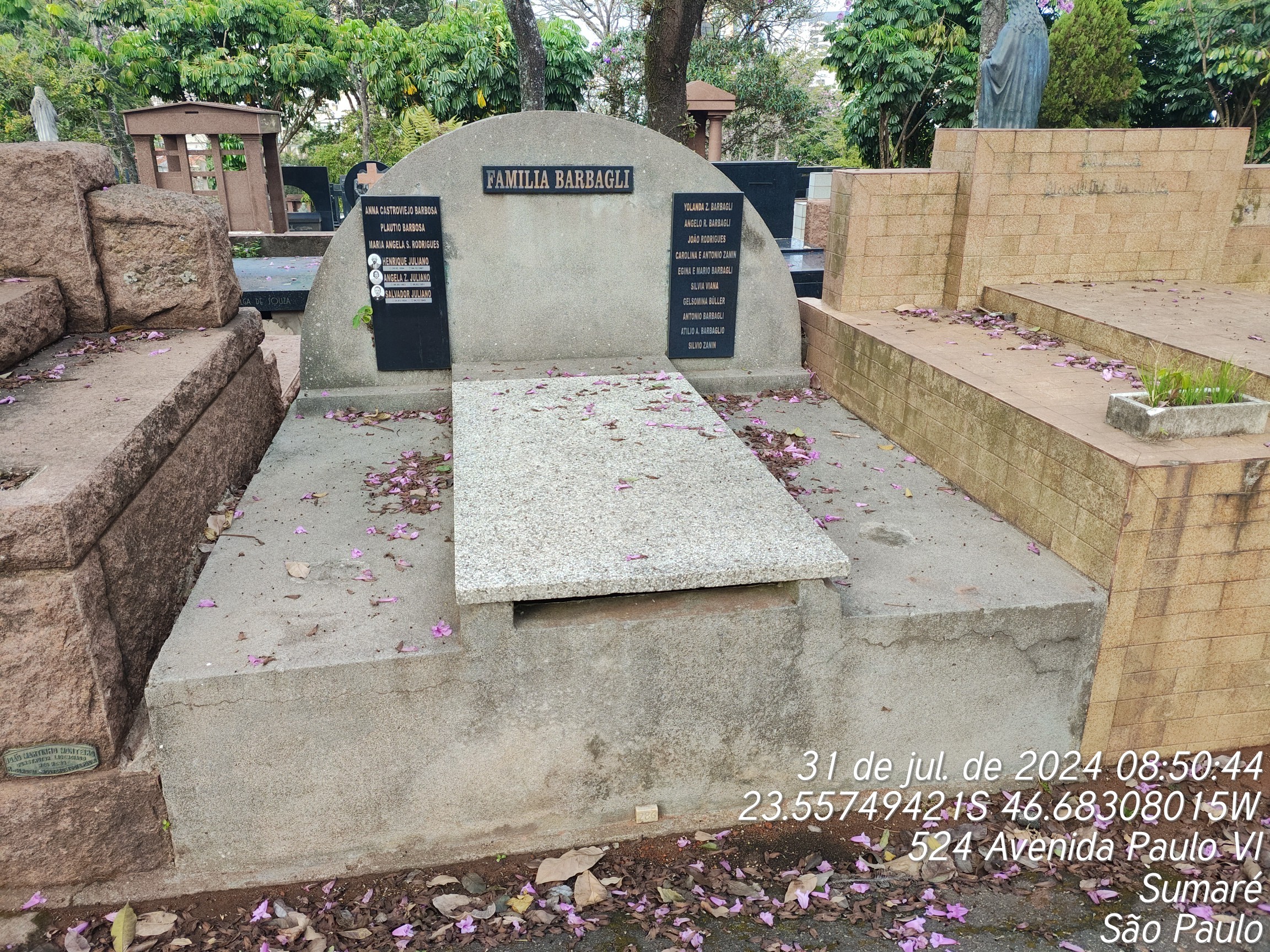 YOLANDA ZANIN BARBAGLI - 27/11/1994, PLAUTIO BARBOSA - 23/02/2006, GELSOMINA BUHLER - 26/05/1941, SILVIA DE SOUZA VIANA - 08/04/1958, JOAO RODRIGUES ABIATTO - 02/08/1970, ANGELA FANINI JULIANO - 05/02/1951, HENRIQUE JULIANO - 04/12/1967, ANGELO RICCINI BARBAGLI - 08/02/1945, MARIO BARBAGLIA - 15/02/1945, ATILIO ANTONIO BARBAGLIO - 24/10/1973, MARIA ANGELA SPACASSASSI RODRIGUES PRIETO - 09/08/1989, ANA DE JESUS - 08/12/1979, SILVIO ZANIN - 08/10/1976