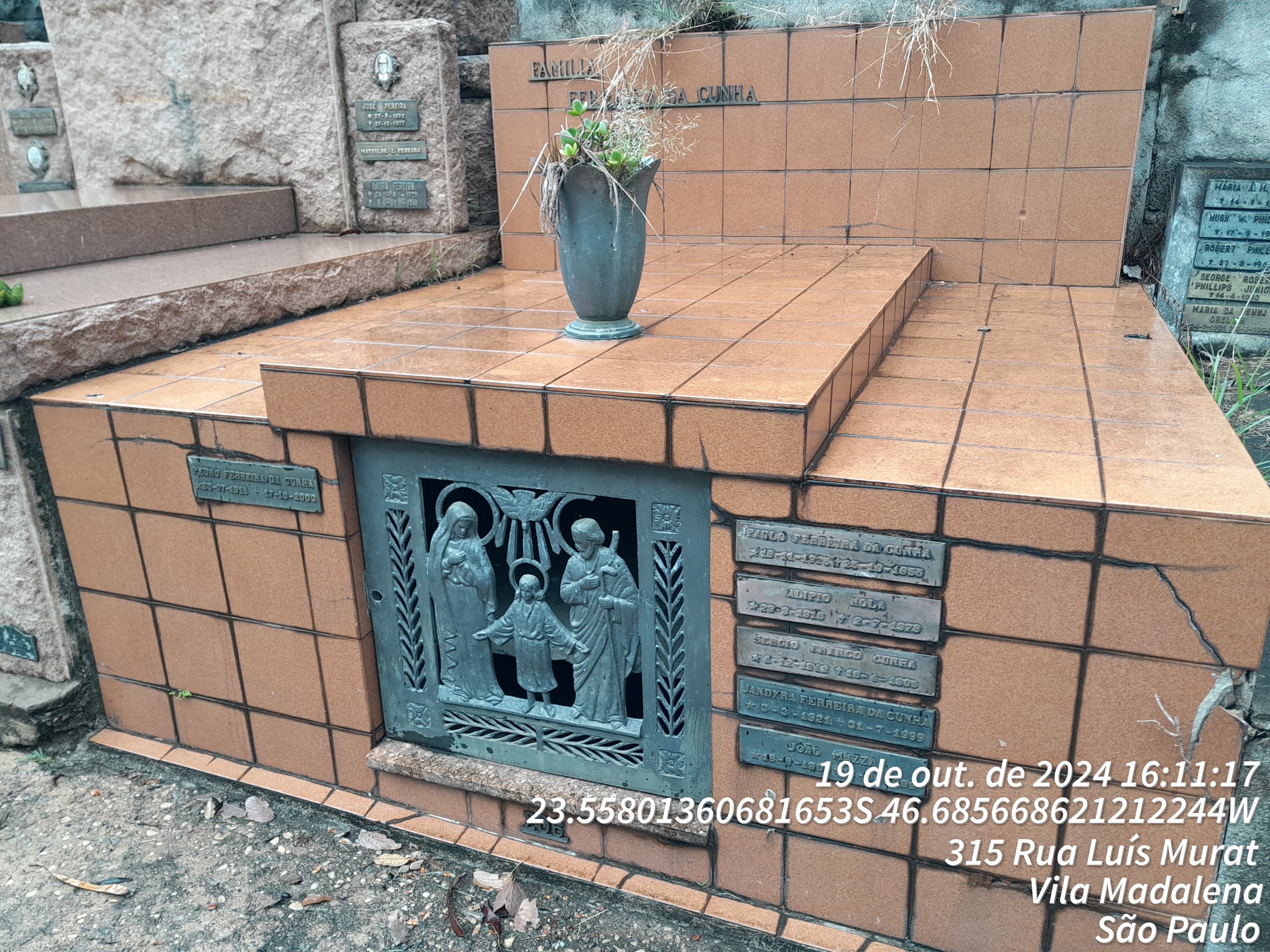 JOAO MAZZA - 28/09/1999, JACYRA DA CUNHA NOLA - 13/05/2009, JANDIRA FERREIRA DA CUNHA - 31/07/1999, PEDRO FERREIRA DA CUNHA - 17/10/2003, JULIETA FERREIRA MAZZA - 12/01/2004, IDALGA FERREIRA DA CUNHA ANDRADA - 12/05/1970, ALIPIO NOLA - 02/07/1978, SERGIO FRANCO CUNHA - 16/04/1985, PAULO FERREIRA DA CUNHA - 25/10/1955